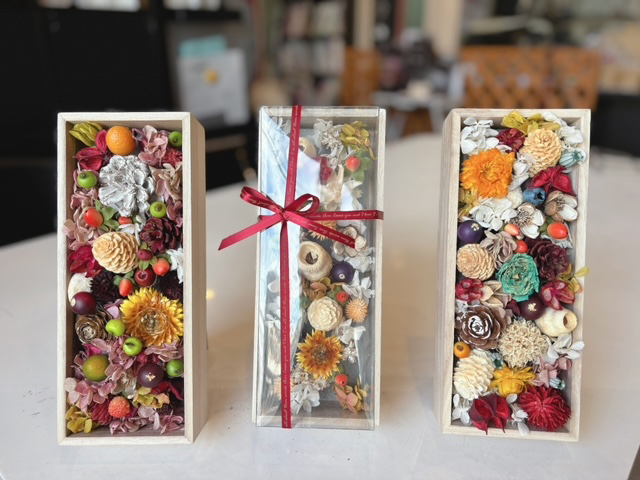 秋の生花アレンジ/木の実やドライフラワーなどを詰め込んだBOXアレンジ11月テーマ: